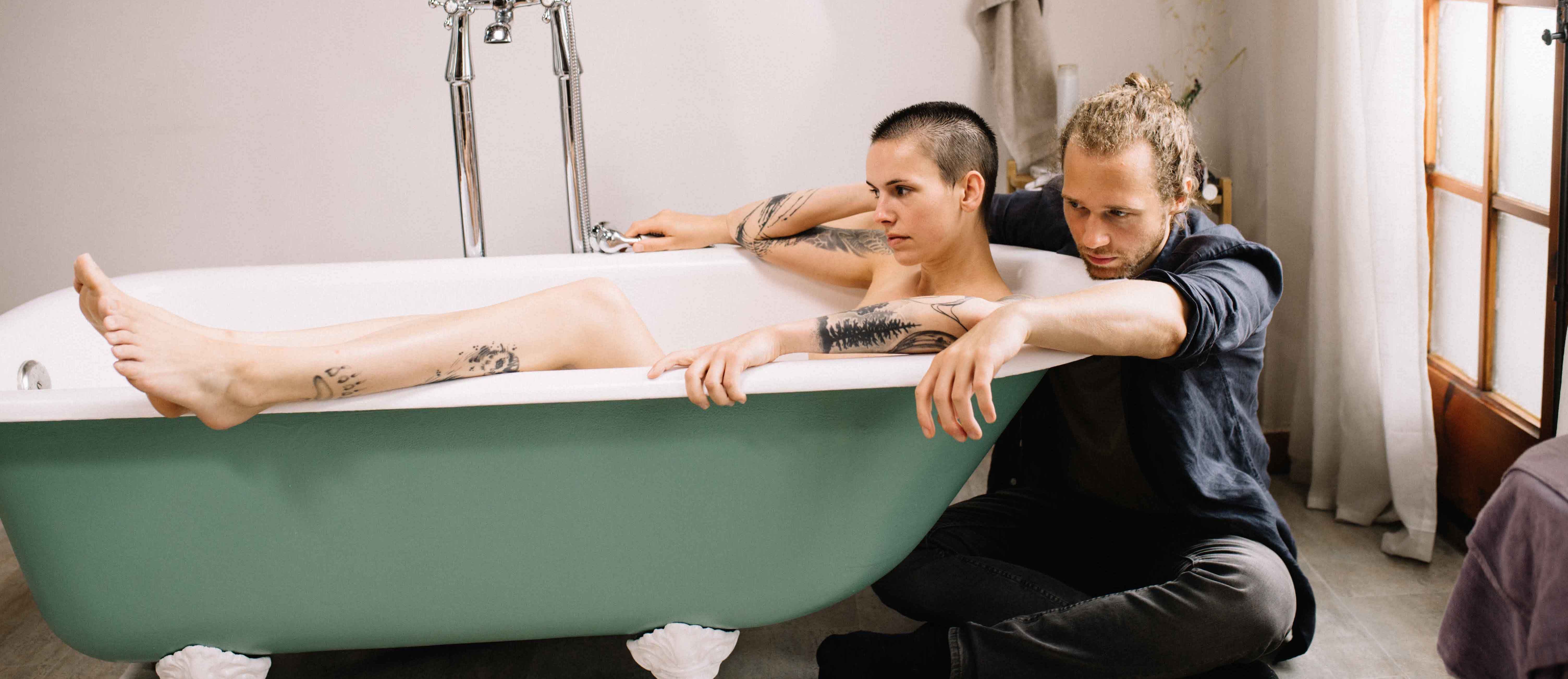 After finishing chemotherapy, Rebecca had a lumpectomy operation which left her unable to shower by herself so her boyfriend would help her in the bath. The way he touched her body during those daily baths reawakened something in her; Wash Me depicts the moment when Rebecca finally felt her body switch back on.